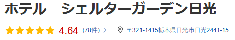 楽天トラベルの口コミでは、シェルターガーデン日光は 総合評価4.6以上 と高い満足度を得ています。